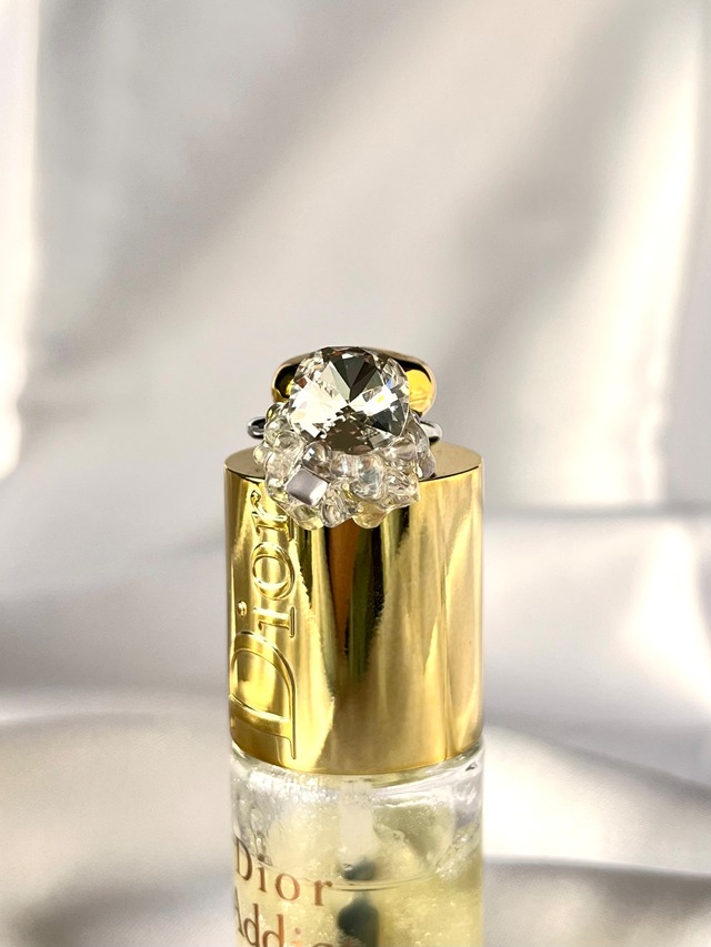 スワロフスキーのクリスタルストーンを大胆に配置し、 輝きを全面に押し出した、なんとも美しいリング。 手元を美しく煌びやかにし、自信をくれる一品です。 長年みなさまに愛されているスワロフスキークリスタル。 クリスタルの輝きの美しさを最大限引き出すために、あえて台座を使わず、ツヤツヤのビーズと一緒に固定することで、スタイリッシュに仕上げました。 また、10mmと大きなクリスタルを使ったので、どこから見ても輝くデザインに。 手元にあることで、手を動かせばいつでもスワロフスキーの輝きを見ることができるので、目にするたびに幸せな気分を味わって頂けます。 存在感があるアイテムなので、キラキラが大好きな女性に、ぜひ使っていただきたいです。 ウエディングはもちろん、オケージョン、女子会、プレゼンなどのお仕事、記念日のディナー等…幅広い場面でお使い頂けます。 贈り物としても喜ばれるアイテムです。 【おそろいのピアス•イヤリングはこちら】 ◼️サイズ モチーフ:1.4cm×1.5cm リング:フリーサイズ ◼️使用パーツ スワロフスキークリスタル チェコビーズ ガラスビーズ メタルビーズ レジン *こちらは、デザインの都合上、シルバーのみのお取り扱いとなります。 *リングはメッキを使用しています。 *金属アレルギーには個人差がございます。全ての方がアレルギー反応が出ないことを保証するものではございませんのでご注意ください。 *モニターにより色味が異なる場合がございます。