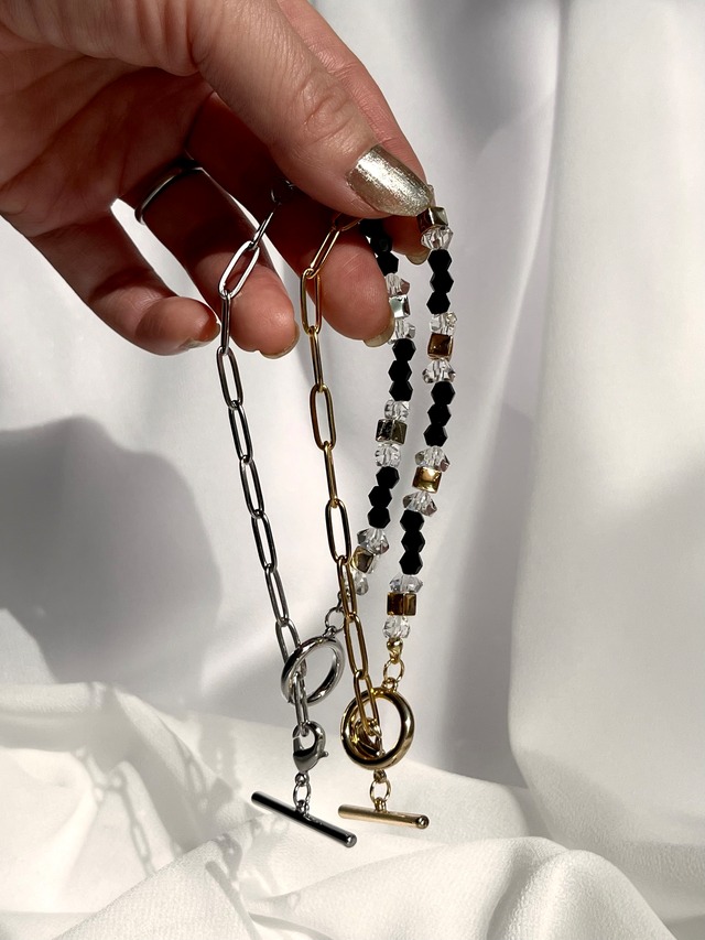 クリアガラスビーズと黒ビーズを使った、太めチェーンのキリッとカッコいいゴールド•シルバーカラーの【ブレスレット】