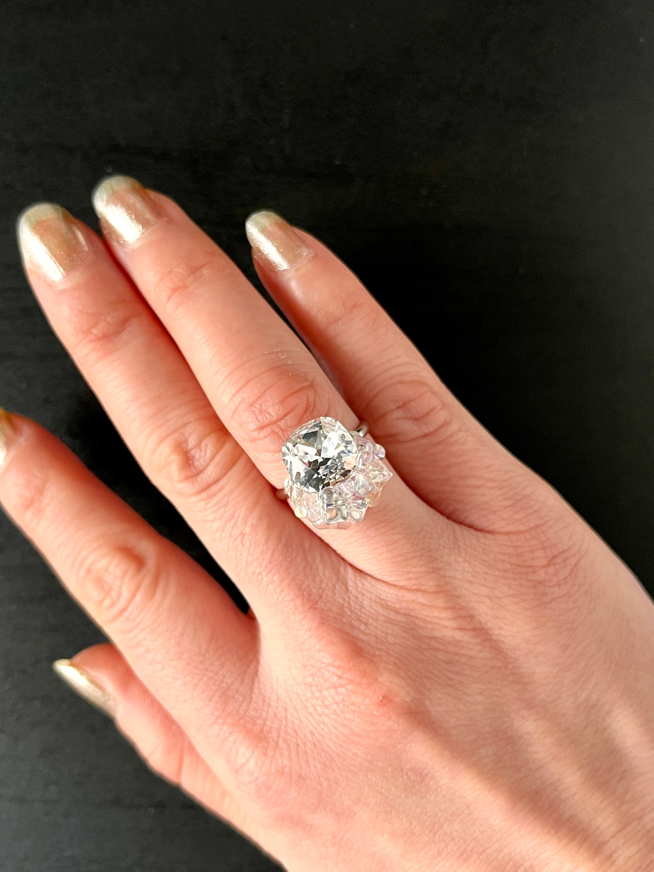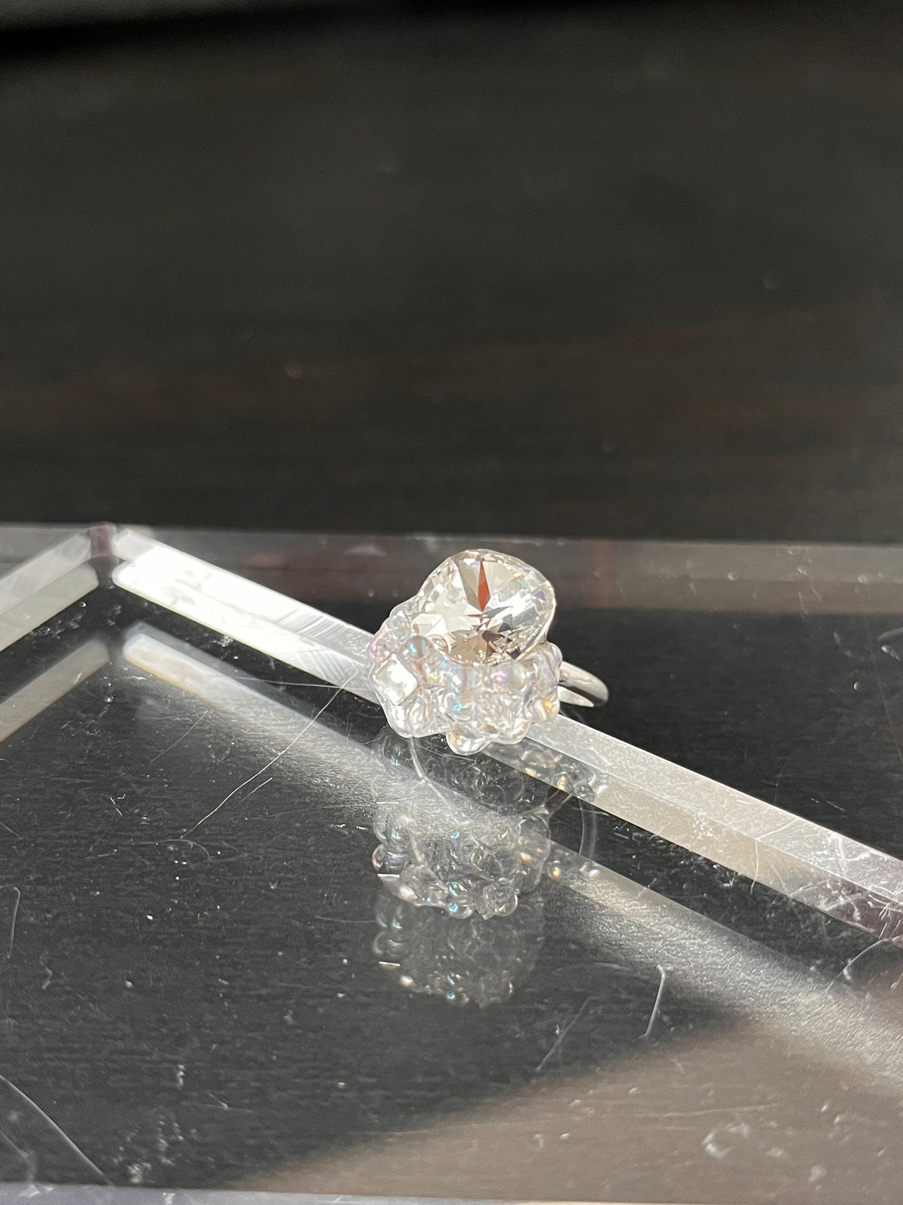 クリスタルの輝きの美しさを最大限引き出すために、あえて台座を使わず、ツヤツヤのビーズと一緒に固定することで、スタイリッシュに仕上げました。