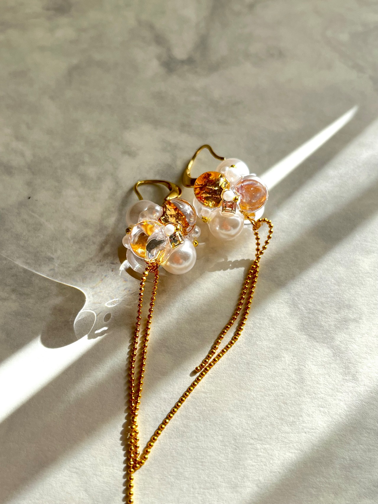 輝きのある透明な丸いパーツは、一つひとつ手作りしていて、なかでもゴールド•シルバーのパーツは”箔”が入れてあるEry Jewelry “オリジナル”パーツ。