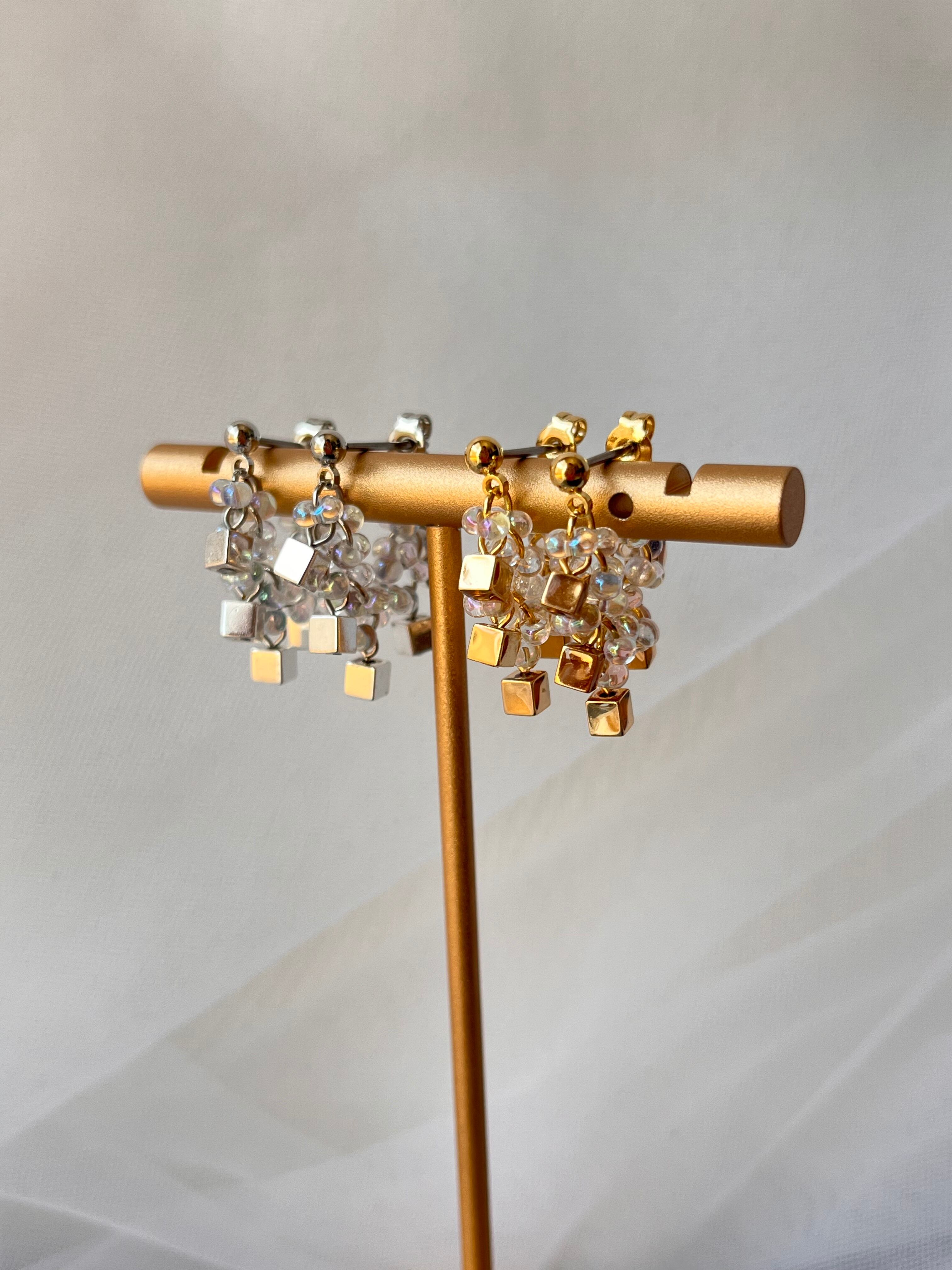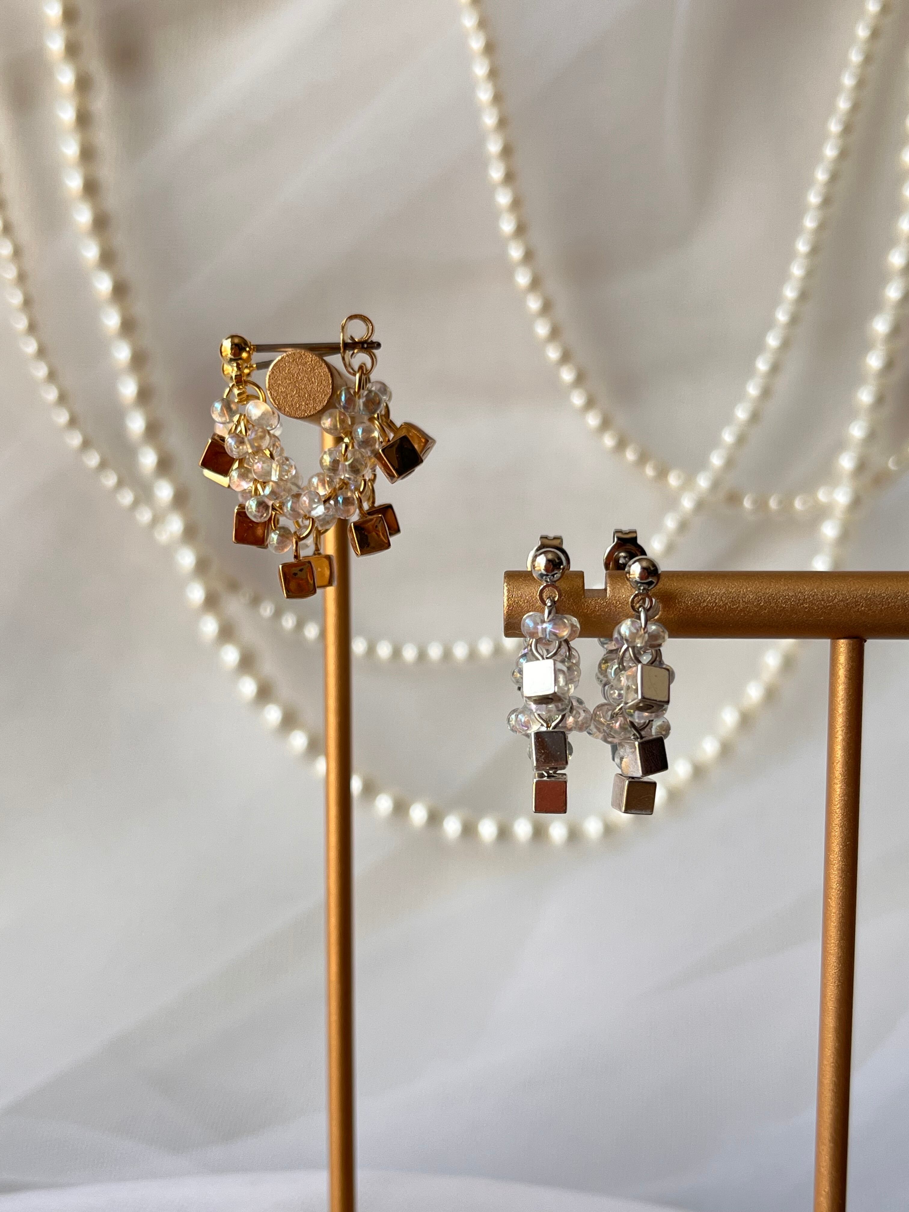 *アレルギー対応といたしまして、チタンのポストピアスとサージカルステンレスのキャッチを使用しております。*メタルのスクエアパーツは、アレルギー対策と変色防止対策として、レジンでコーティングをしてあります。