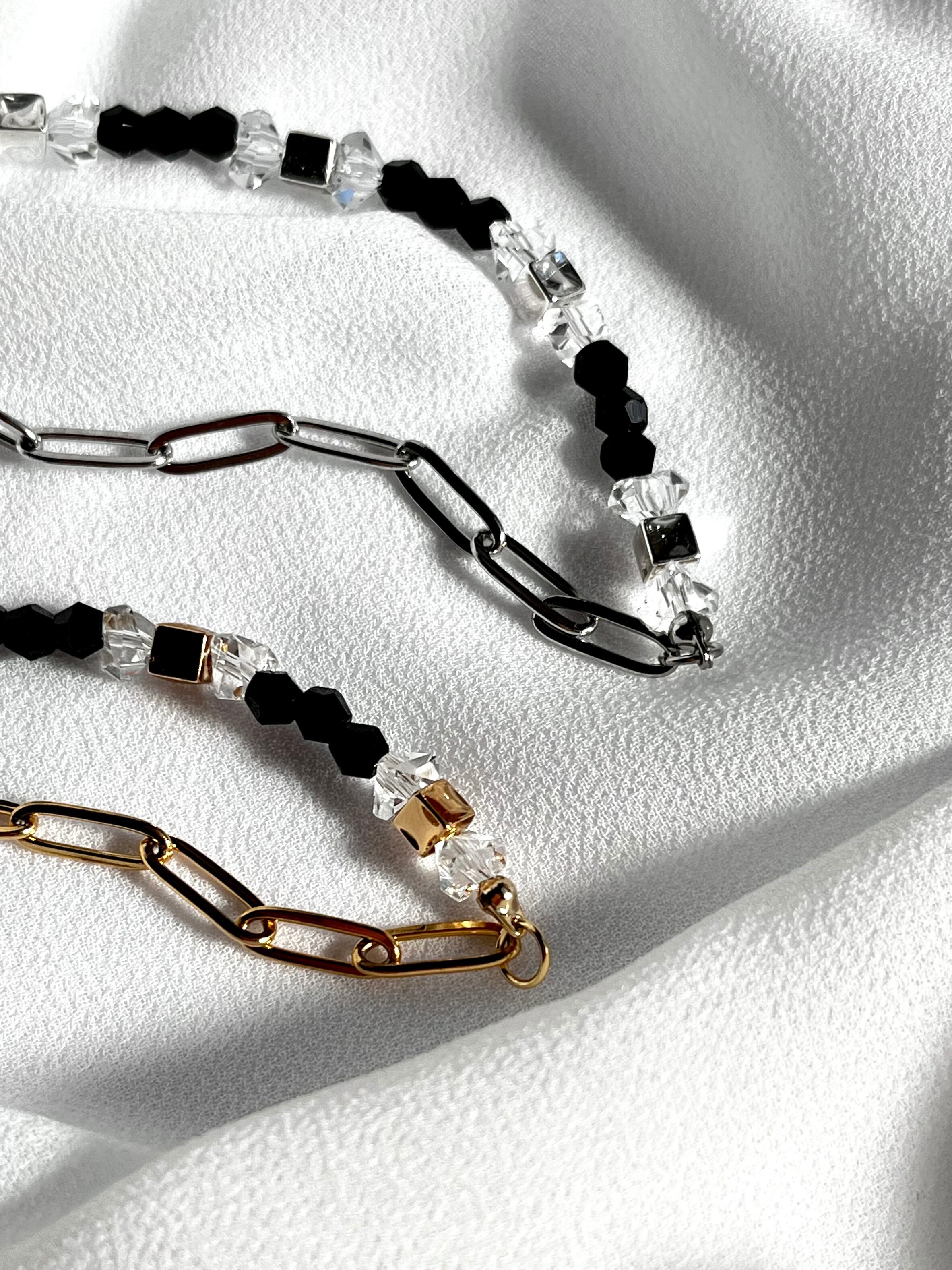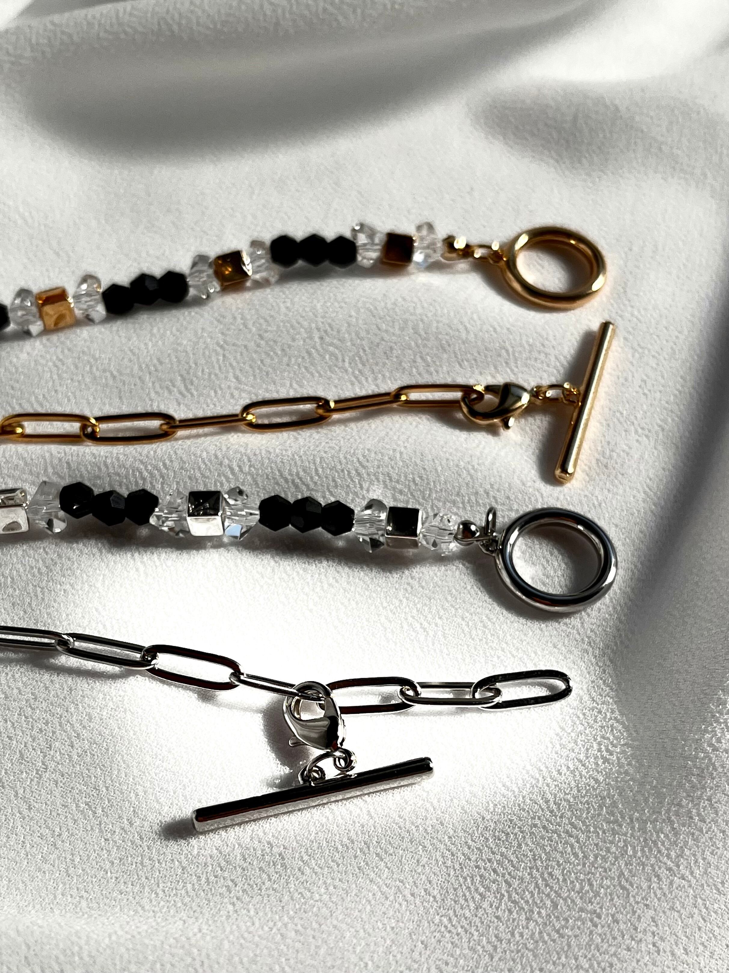 キラキラのガラスビーズとゴールド•シルバーのスクエアメタルビーズを黒のビーズで挟んだ、クールなブレスレット。