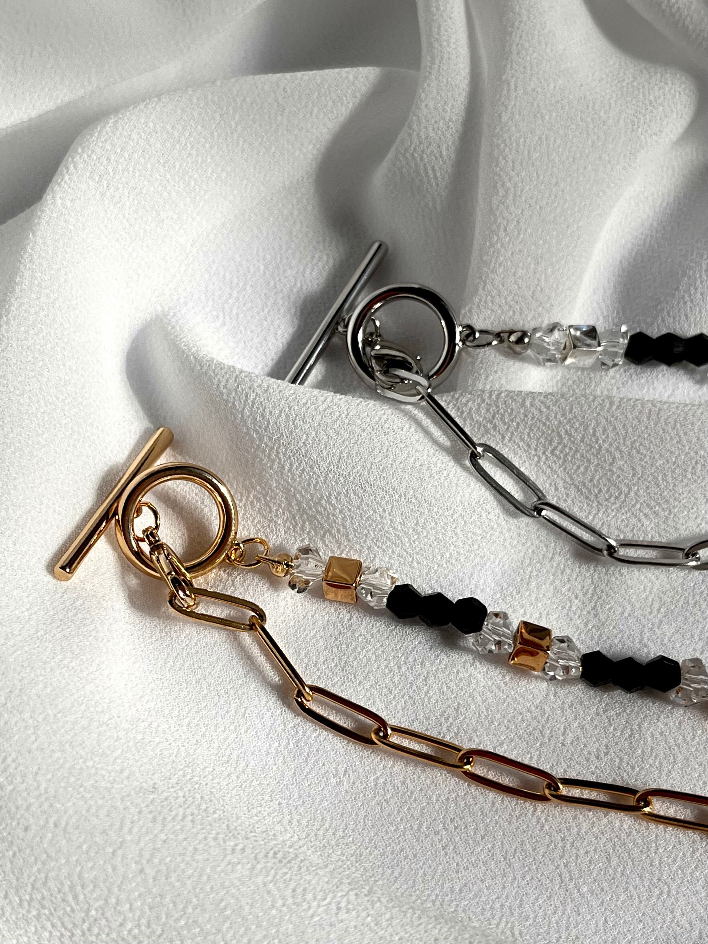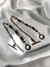 黒が多めなので、お手持ちのファッションがキリッと引き締まり、更に太めのチェーンを繋げることにより存在感を出しました。